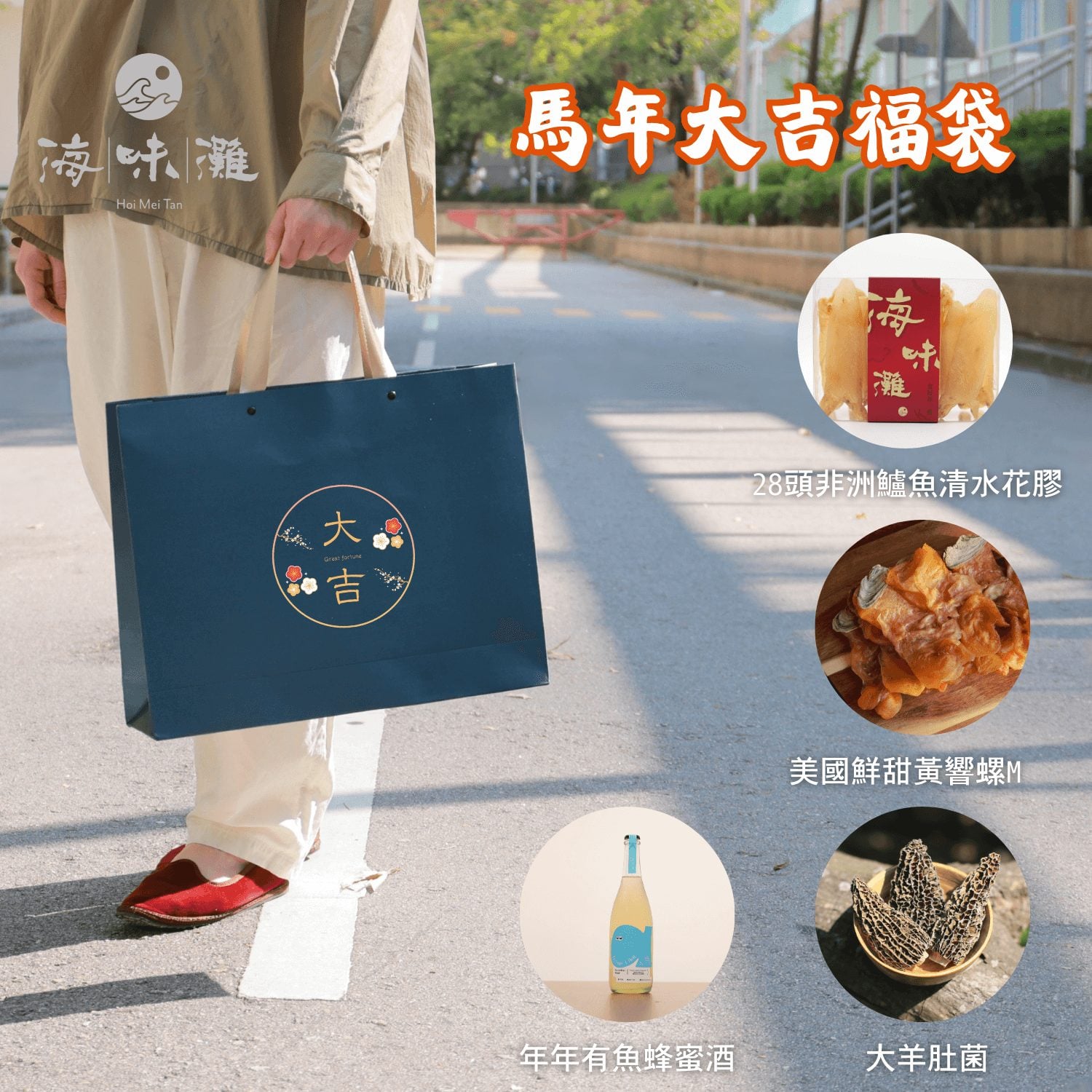 AA28頭非洲鱸魚清水花膠300克 x 1盒 美國鮮甜黃螺片M 300克 x 1包 年年有魚蜜糖酒 X 1支 大羊肚菌75克 x 1包 孔雀藍色絲綢袋 x 1個